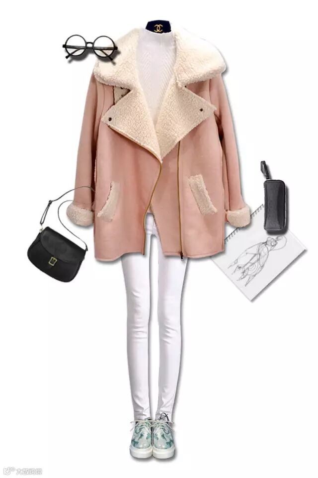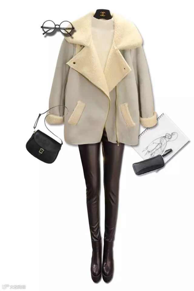 羊剪毛短外套今年非常流行,保暖性十足,白色的羊剪毛内搭浅色的高领针织打底毛衣,配上黑色PU加绒铅笔裤,配上真牛皮短靴,很机车风格,但也很保暖的搭配,不挑人显瘦~