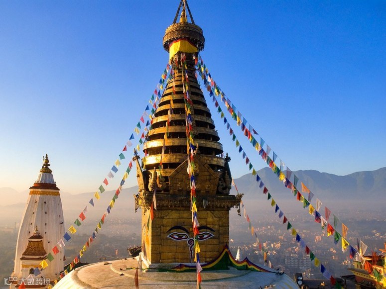 斯瓦扬布寺(意为“自体放光”)是亚洲最古老的佛教圣迹之一,位于尼泊尔首都加德满都西面,又因庙中栖息着数百只野生猴子,俗称“猴庙”。该寺主体建筑是一座“柴特亚”式大佛塔,纯白色的塔基,金黄色的塔身,塔顶是层层递减的十三层镀金环轮,象征菩萨从因至果的十三行位,最高层的伞盖便代表了涅盘胜果。