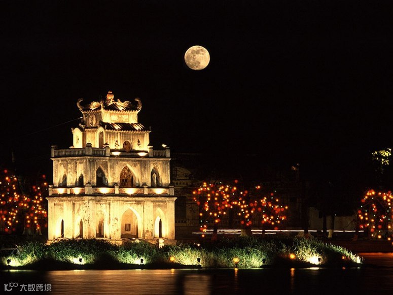 建于1884年的河内龟塔,位于还剑湖中的龟丘岛上是一座多层尖顶四角飞檐的小塔。图中龟塔在灯光下更加玲珑剔透。