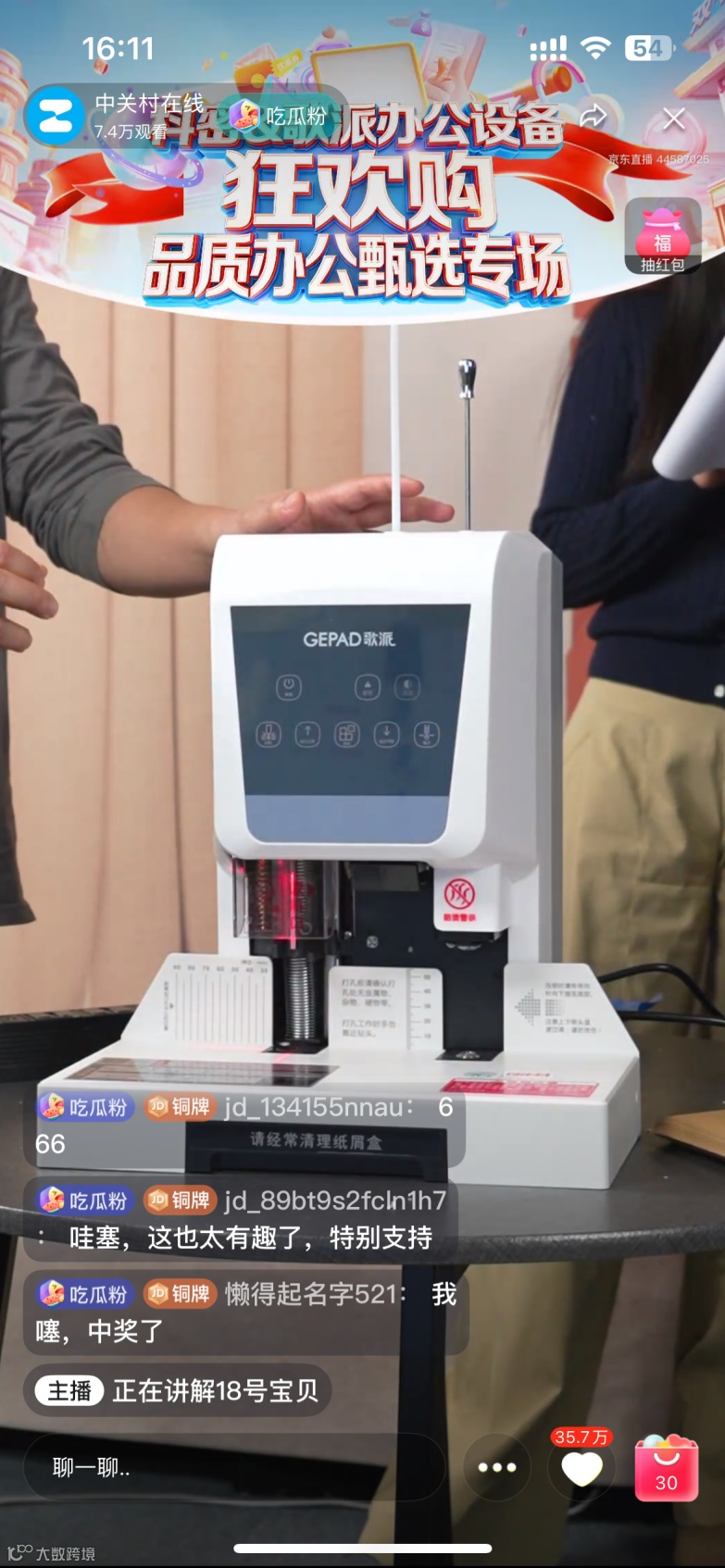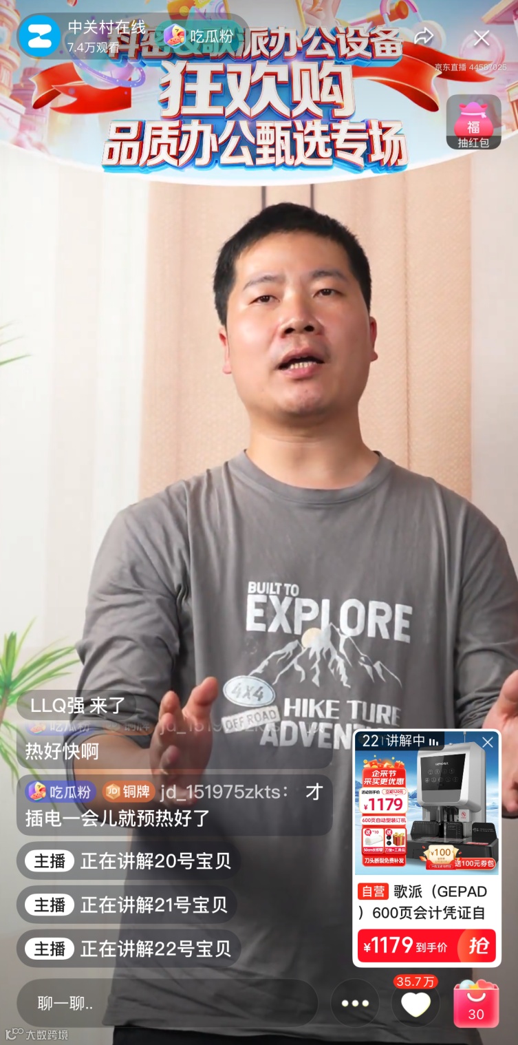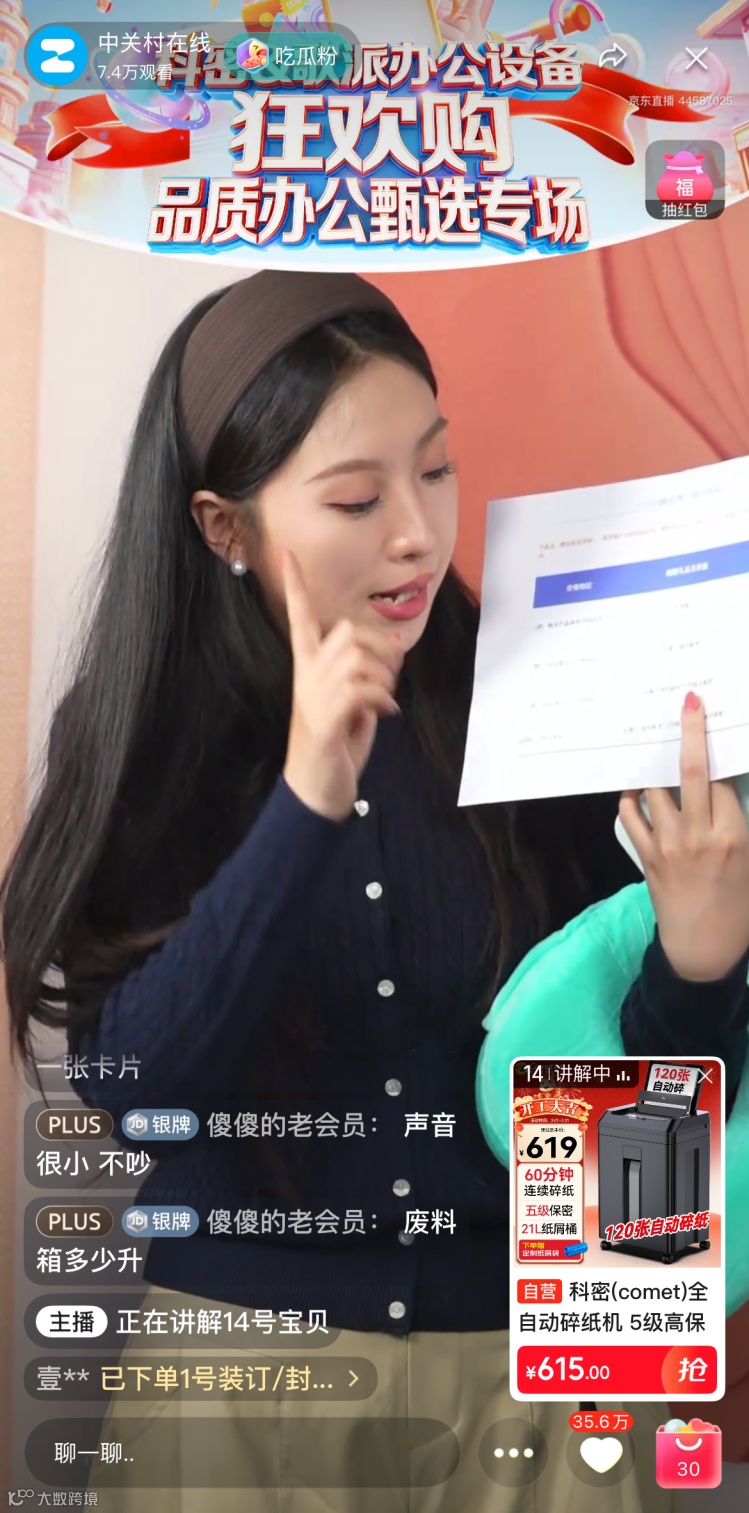 本次直播重点展示了科密与歌派的明星产品,尤其是搭载智能安全触停功能的科密黑金刚碎纸机和省时省心的全自动财务装订机,成为全场焦点!两款机型凭借卓越的性能和创新的安全设计,赢得了直播间观众的一致好评!