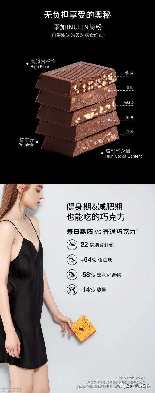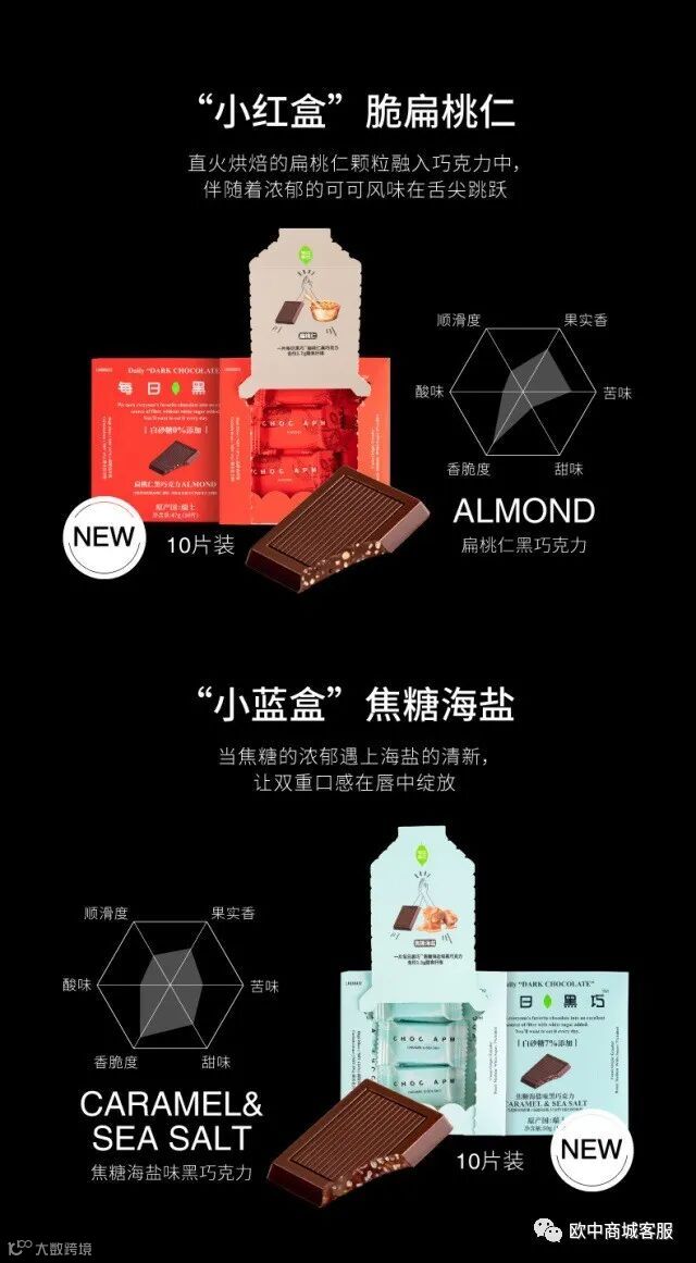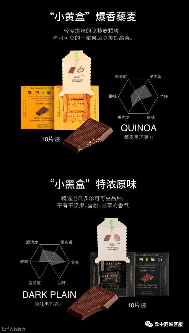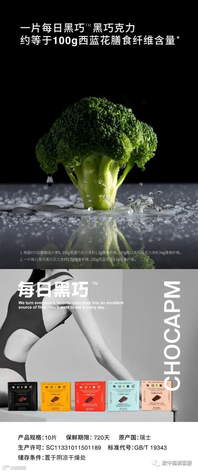 每日黑巧相较于普通巧克力零添加白砂糖,无糖摄入身体无负担。有着普通巧克力20倍膳食纤维含量,一片每日黑巧相当于100克西兰花膳食纤维的含量。
