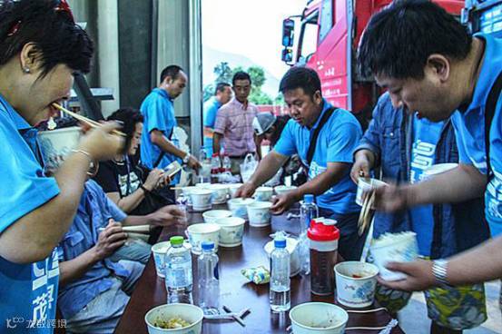 在茂县灾区卸完捐赠物资后力倍特的“爱心志愿者”开始了特殊意义的午餐