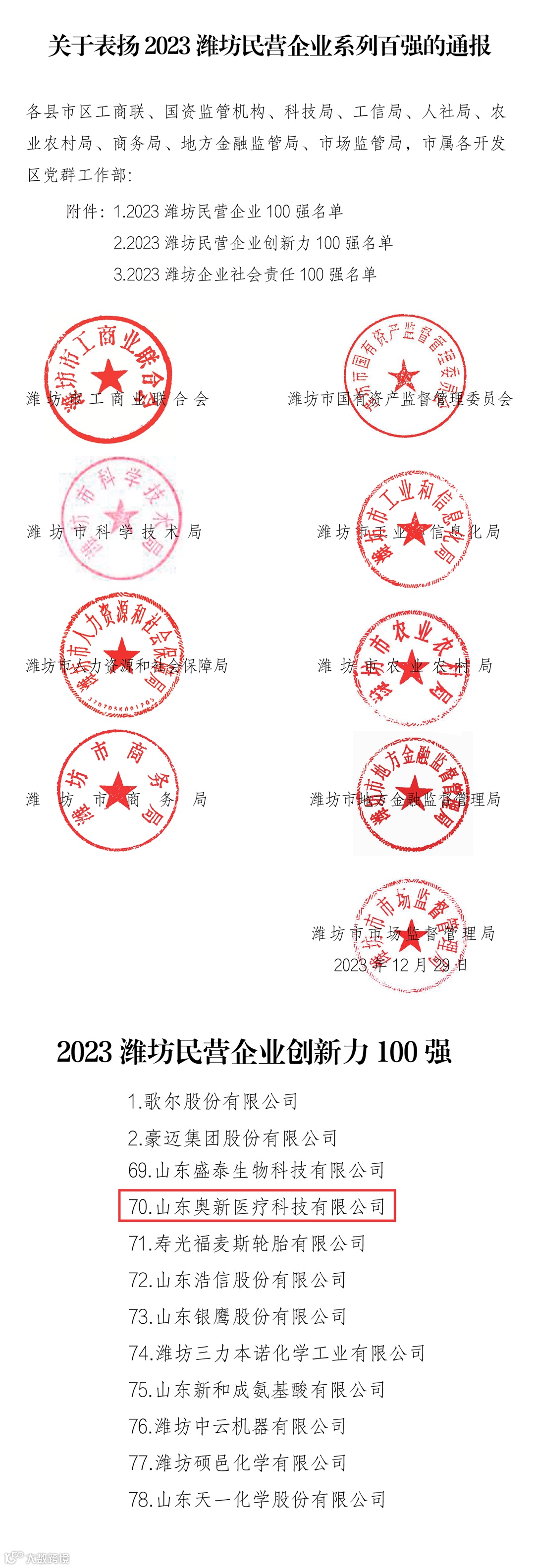 新年伊始,作为前沿精准医学影像装备领航者的山东奥新医疗科技有限公司,荣登2023潍坊市民营企业创新力100强榜单!潍坊市民营企业创新力百强评选,由潍坊市工商业联合会、国有资产监督管理委员会、科技局、工信局、人社局、农业农村局、商务局、地方金融监管局、市场监管局9个部门组织,经过各县市区推荐、评选办公室初评、主办单位集体研究、媒体公示等程序,最终确定了入选名单。奥新医疗凭借过硬的创新实力成功入选。