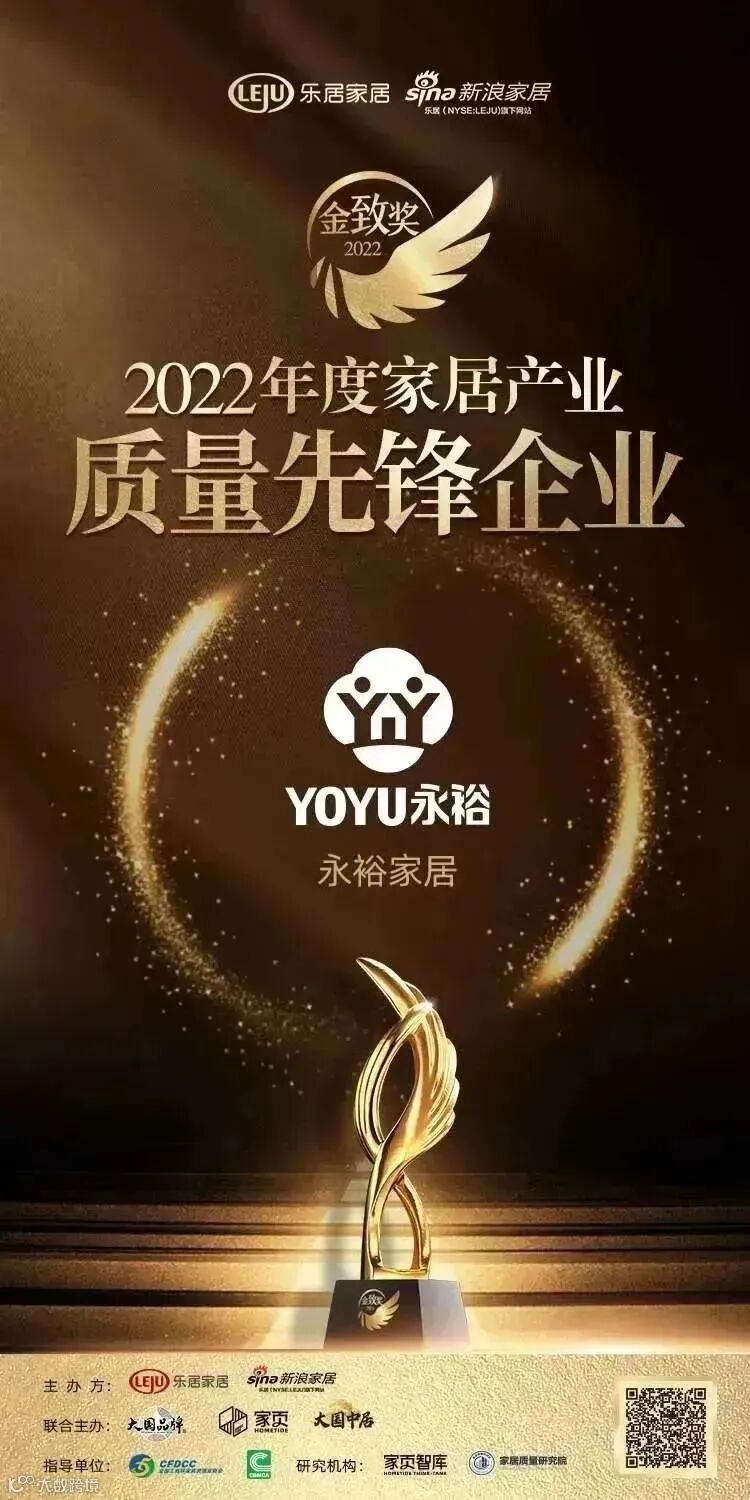 2022年12月26日,由乐居家居主办,新浪家居承办,大国品牌、家页智库、大国中居联合主办的『趁势·再起——2022中国家居新时代盛典暨金致奖颁奖典礼』在云端盛大开幕。此次盛典,永裕家居凭借精益求精的生产技术和高质量产品荣获“2022年度家居产业质量先锋企业”,这是继永裕家居斩获“2022中国家居综合实力100强品牌”后获得又一项殊荣。