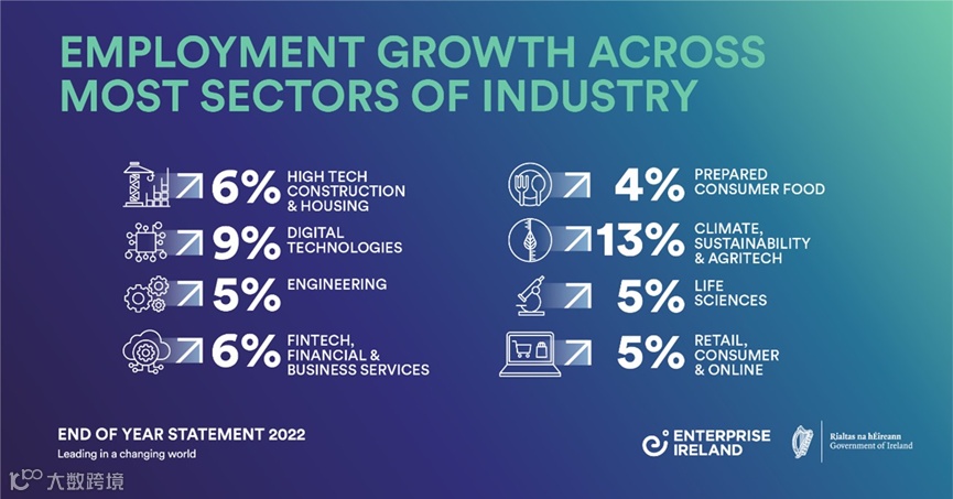 爱尔兰贸易与科技局首席执行官Leo Clancy表示:“我很高兴地宣布,2022年是强劲的一年,我们的客户公司创造了19660个新工作岗位,就业净增长了5%。这与最新的2022年爱尔兰国家统计局(CSO)的劳动力就业调查相比较,显示出整个经济体的总就业增长了3.4%。”