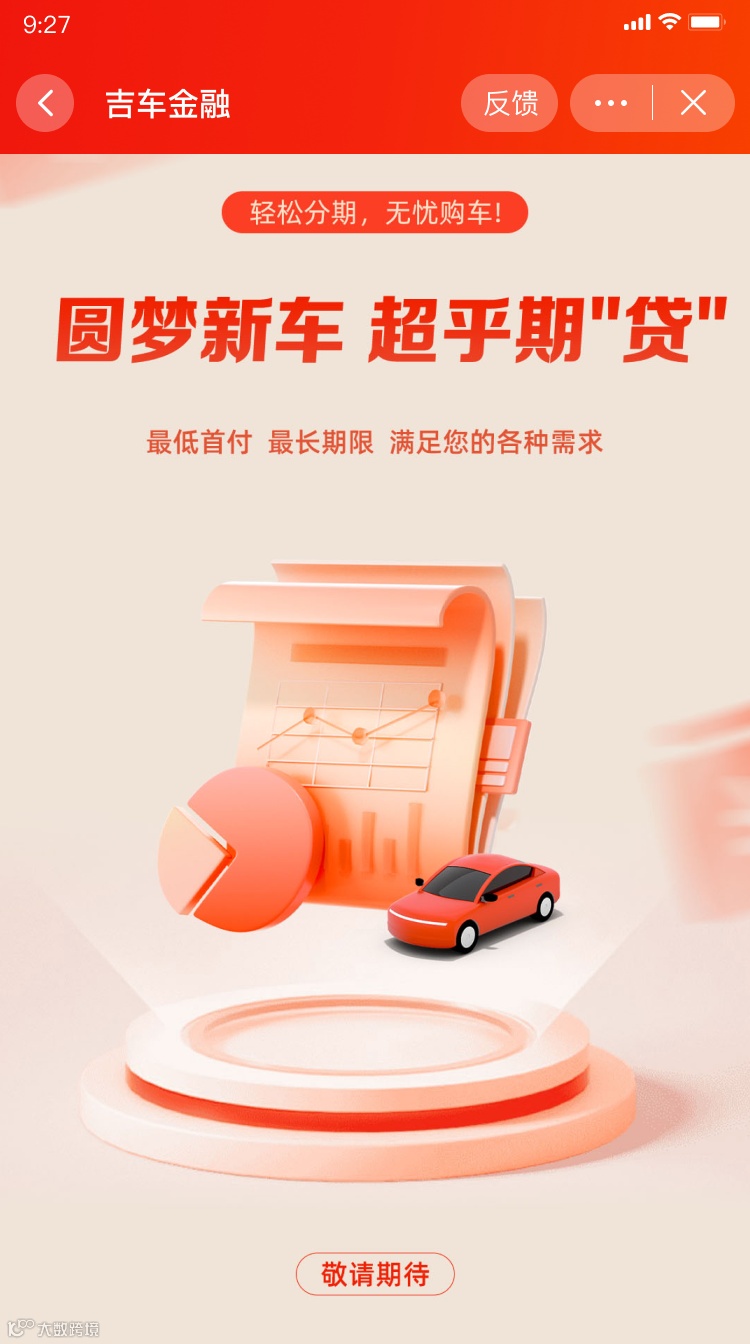 预告一项值得期待的好消息——吉车金融即将推出划时代的分期购车项目,最低首付就能驾驶新车回家。让每一次投资都心安理得,随心所欲。