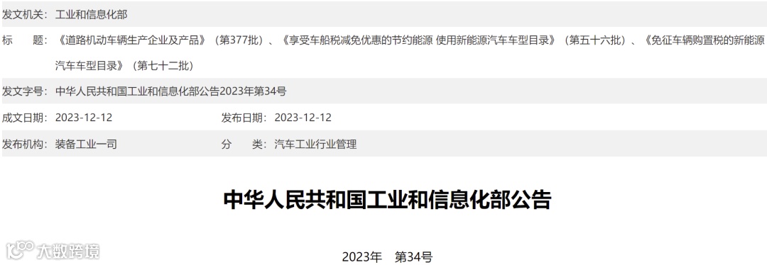 12月12日,工业和信息化部发布“关于《道路机动车辆生产企业及产品》(第377批)、《享受车船税减免优惠的节约能源 使用新能源汽车车型目录》(第五十六批)、《免征车辆购置税的新能源汽车车型目录》(第七十二批)的公告”。。