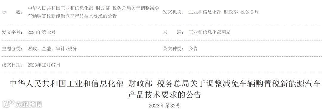 12月7日,工业和信息化部、财政部 税务总局三部委联合发布《关于调整减免车辆购置税新能源汽车产品技术要求的公告》。