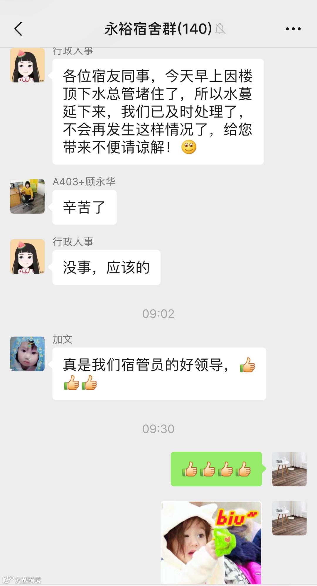 人事行政中心第一时间解决宿舍楼漏水问题,获得员工们大力点赞。