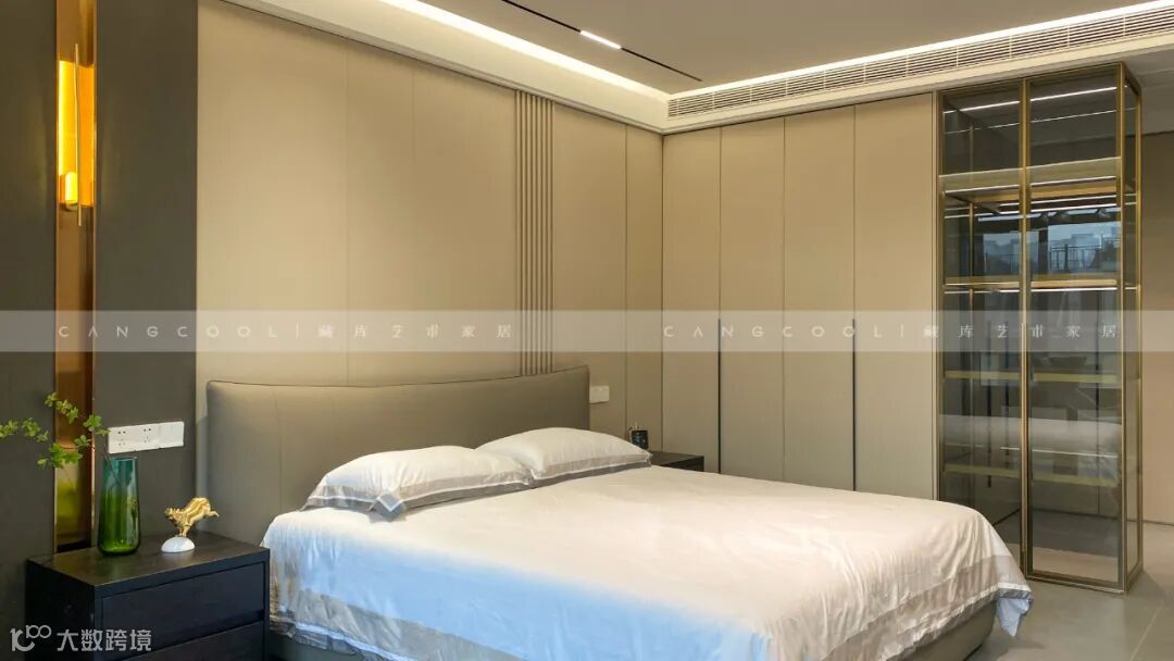 卧室中的家具不多,背景棕色的内敛低调,材质碰撞加深背景墙的层次感。极简空间注重的是细节的表达,体现真正的软装品质感