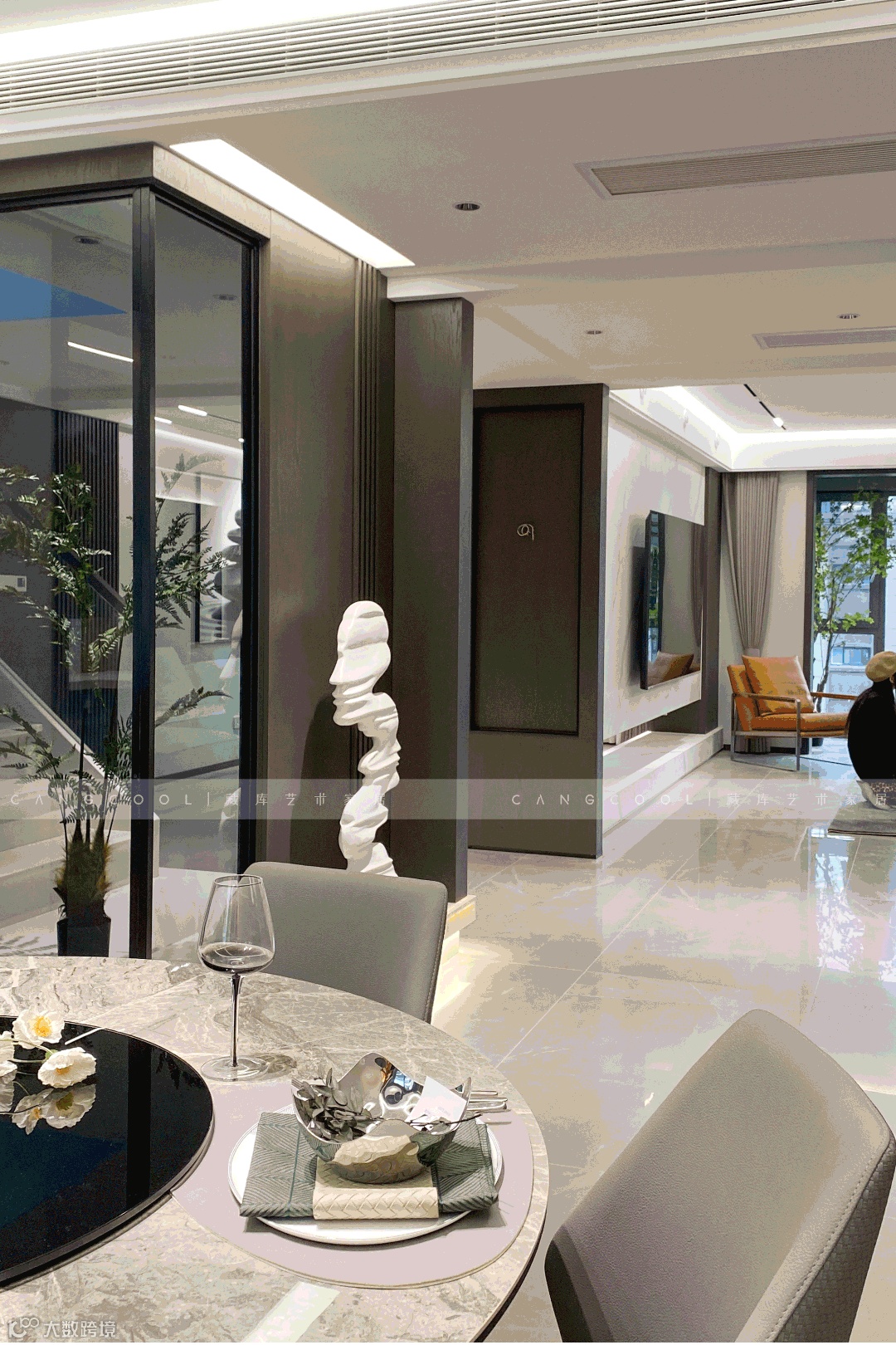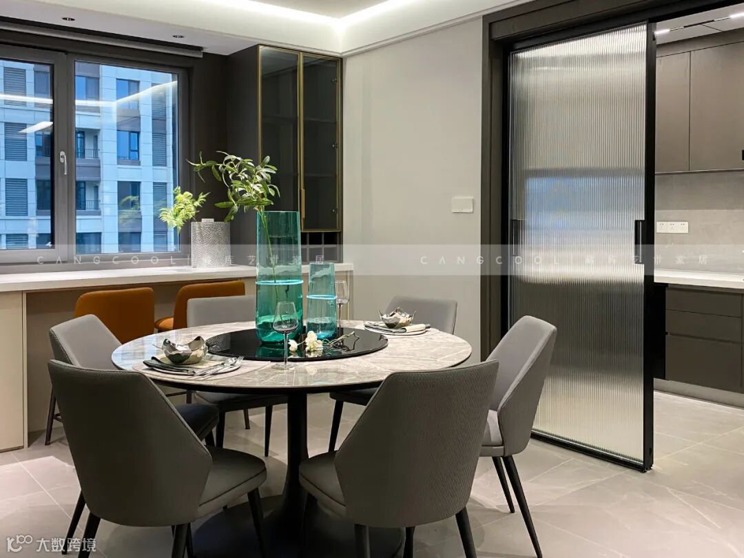 餐厅使用意式极简的代表材质—纹理清新自然的天然大理石及岩板,用竖线线条展示方正的感觉,同时用弧线元素营造温馨的感觉,给人舒适的就餐环境