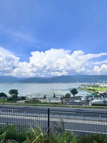 诹访湖,《你的名字》中的系守湖。湖是在群山环绕的盆地里,要从山上观赏湖景。我们到达的时候,太阳高照,金色的阳光洒在湖面,周围都是一个个的小房子把湖面包围着。