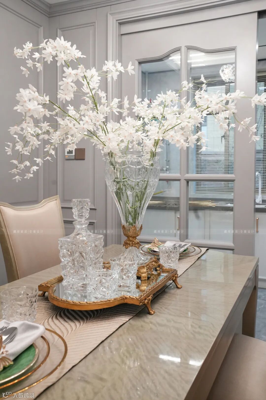 细腻自然的木质花纹和大气简约的设计造型达到美学平衡,香槟金搭配蔷薇粉的高背餐椅精致浪漫,搭配切割纹理whisky水晶杯,宛如手握星河。