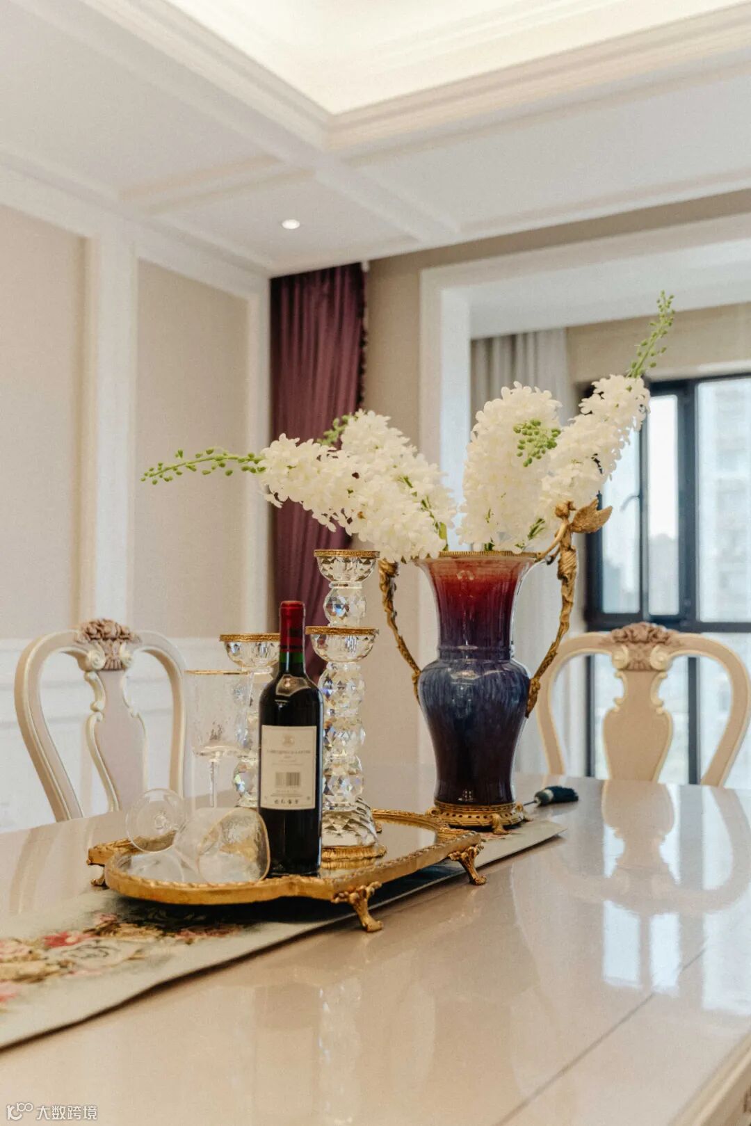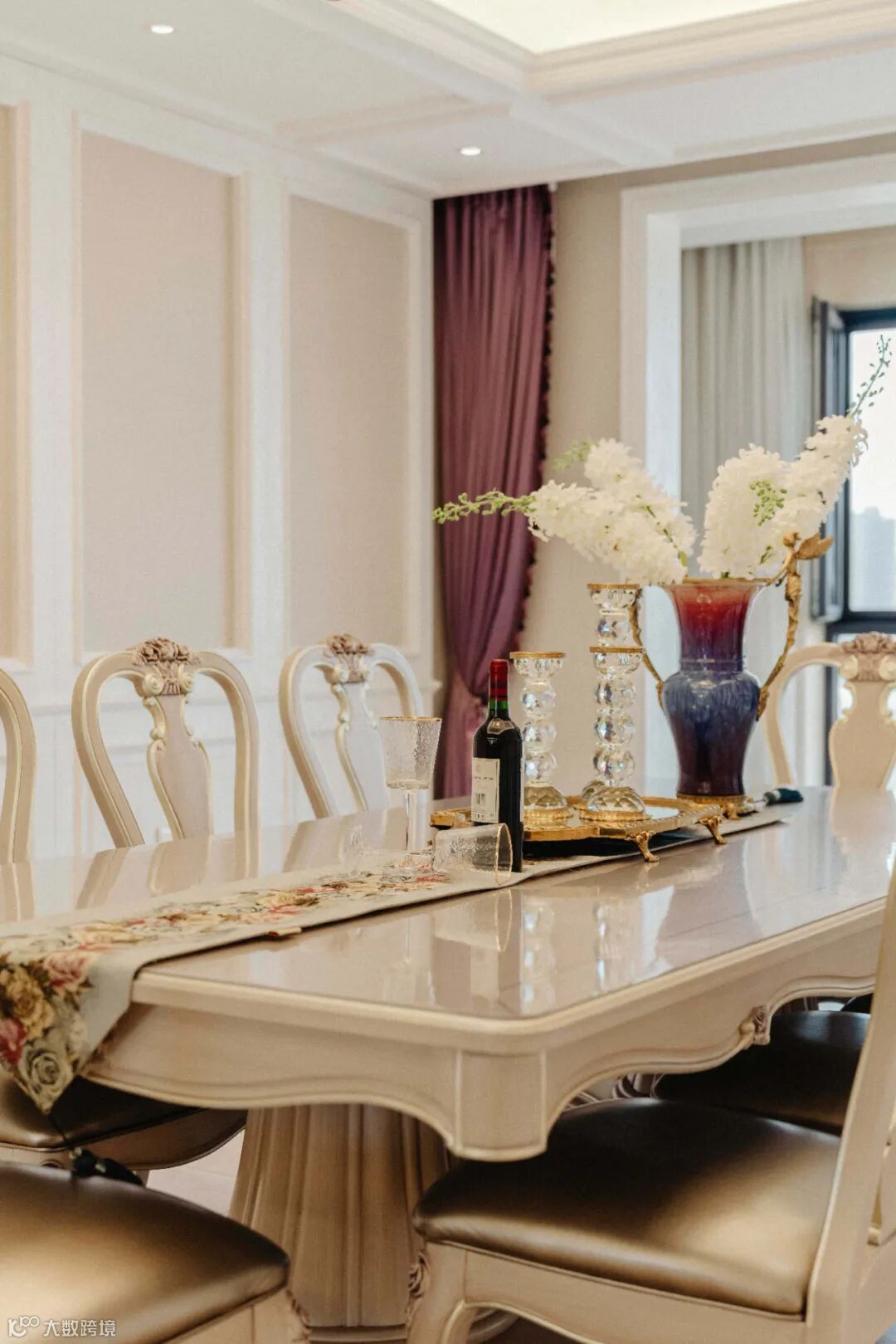 餐桌上放置着餐具与桌旗,使得整个用餐空间更加惬意、生活化