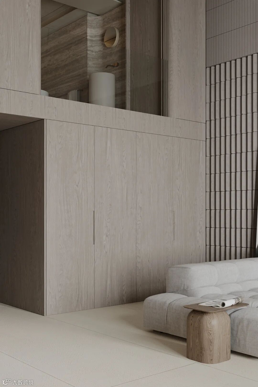 入户处选用的宁谧柔和的色调,在柔亮的灯光下呈现微妙细腻变化。起居空间整体以米白和灰色为主色调,在细节设计上,以简驭繁,从整体到局部的精雕细琢,无论是灯光的设置还是家具的摆放,都给人带来一丝不苟的印象。
