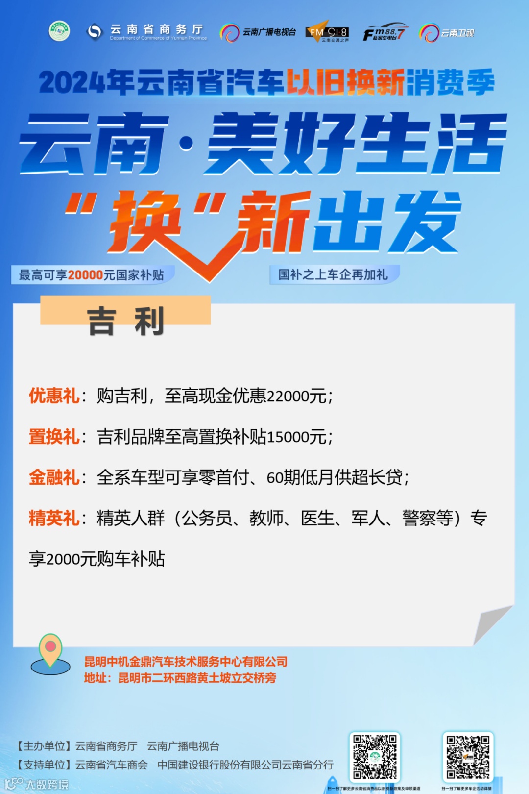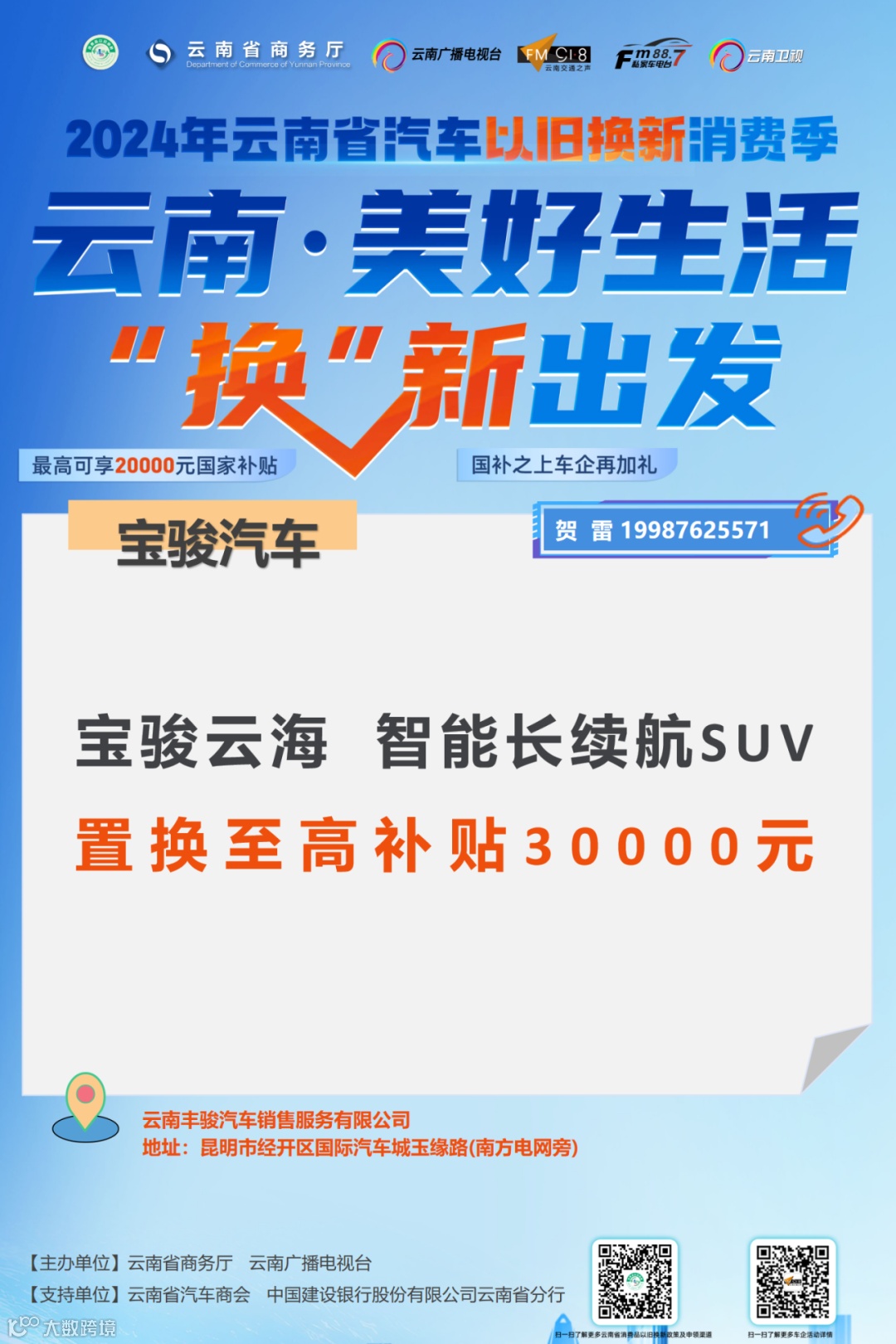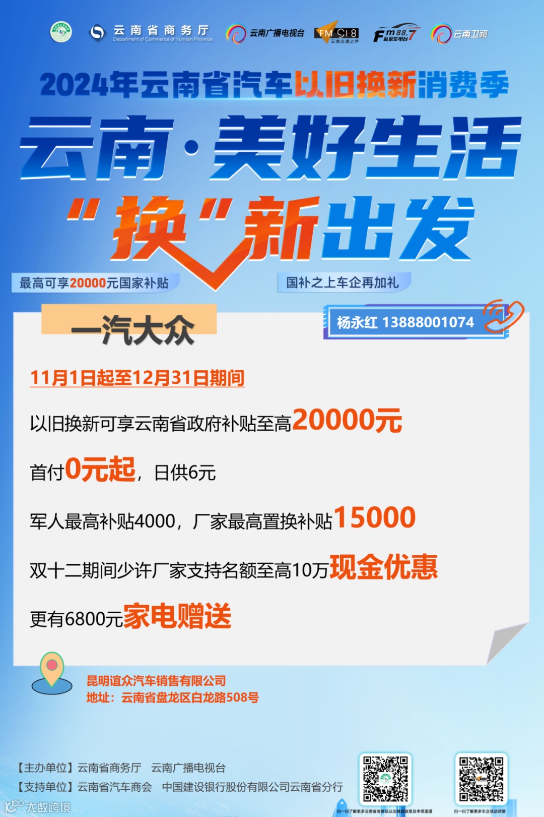 车企可关注“918云南交通台”微信公众号回复关键词“以旧换新”或直接扫描下方二维码进行活动报名。
