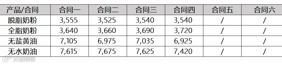 脱脂乳粉价格上涨5.2%,均价3,409美元/公吨;全脂乳粉价格下跌4.0%,均价3,709美元/公吨;黄油价格下跌0.9%,均价6,868美元/公吨;无水奶油上涨6.4%,均价7,602美元/公吨。具体拍卖结果如下: