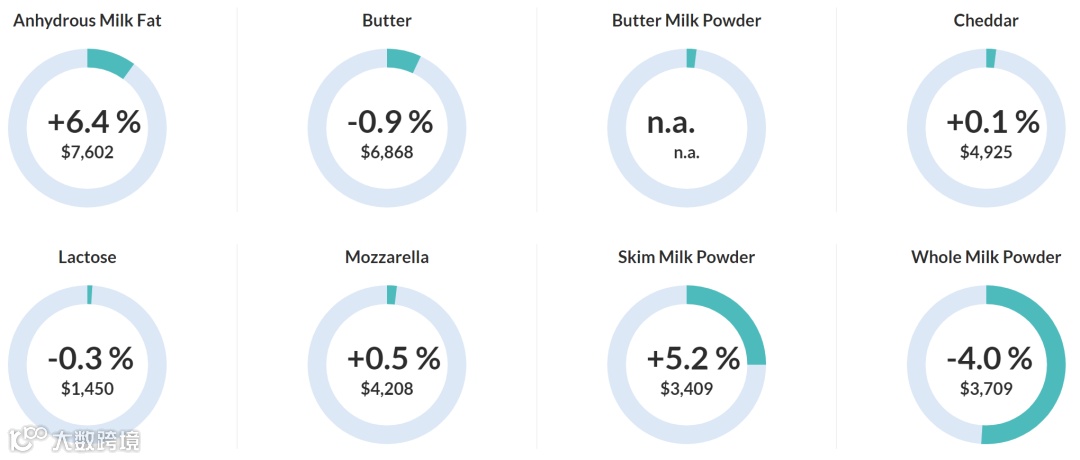导读:脱脂乳粉价格上涨5.2%,均价3,409美元/公吨;全脂乳粉价格下跌4.0%,均价3,709美元/公吨;黄油价格下跌0.9%,均价6,868美元/公吨;无水奶油上涨6.4%,均价7,602美元/公吨