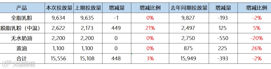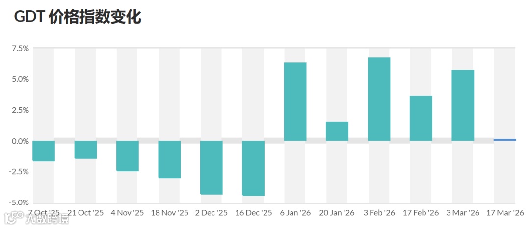 2026年3月17日GDT第400次拍卖,环比上期,脱脂乳粉增量21%,其他品种投放量持平。与去年同期比,黄油增量26%,无水奶油减量20%。具体如下: