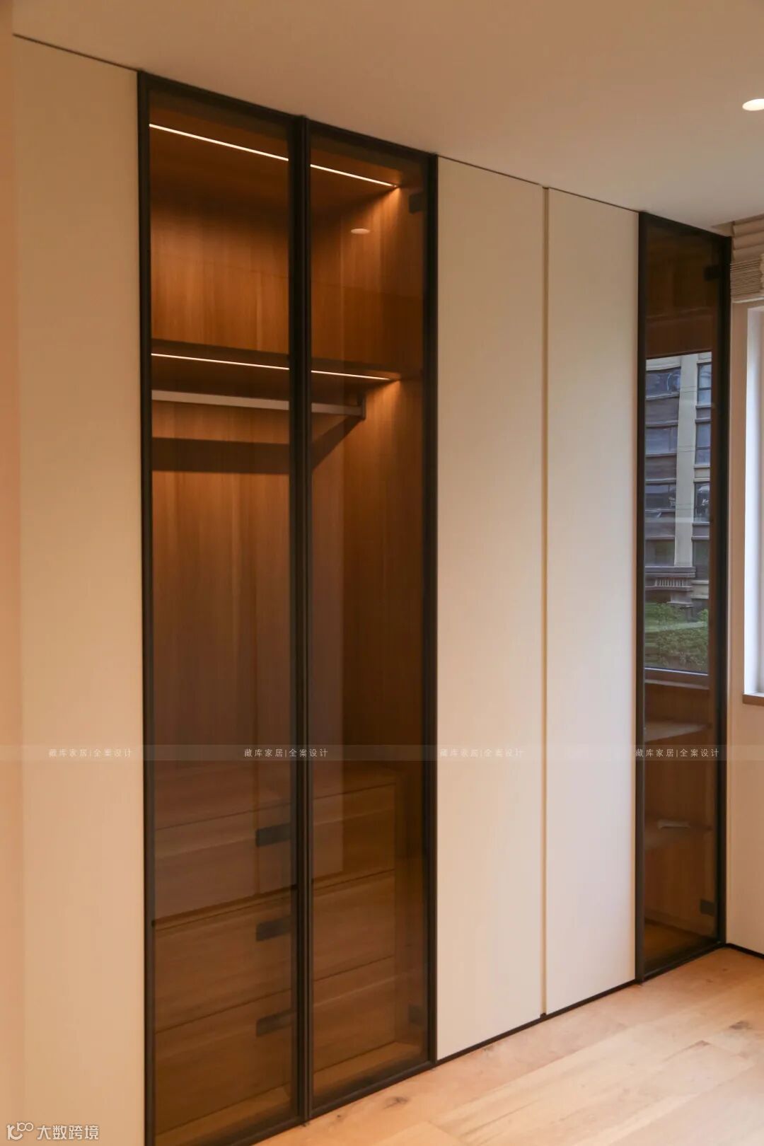 衣帽间设计师选用实木加上暗黑镜面玻璃,智能灯光系统,随心调节室内光线明亮度,让卧室空间简洁之余更多了几分时尚与品味。