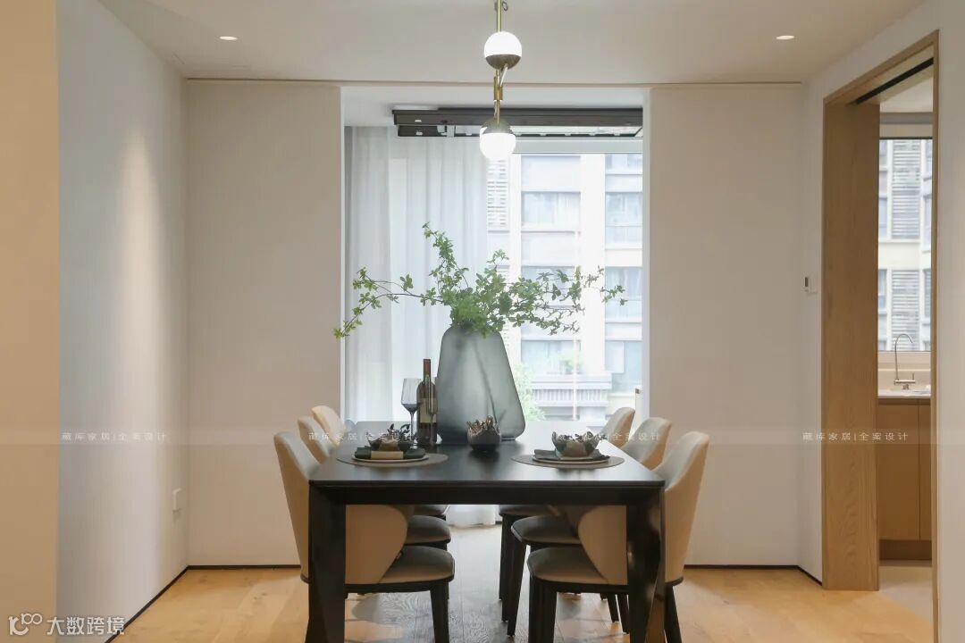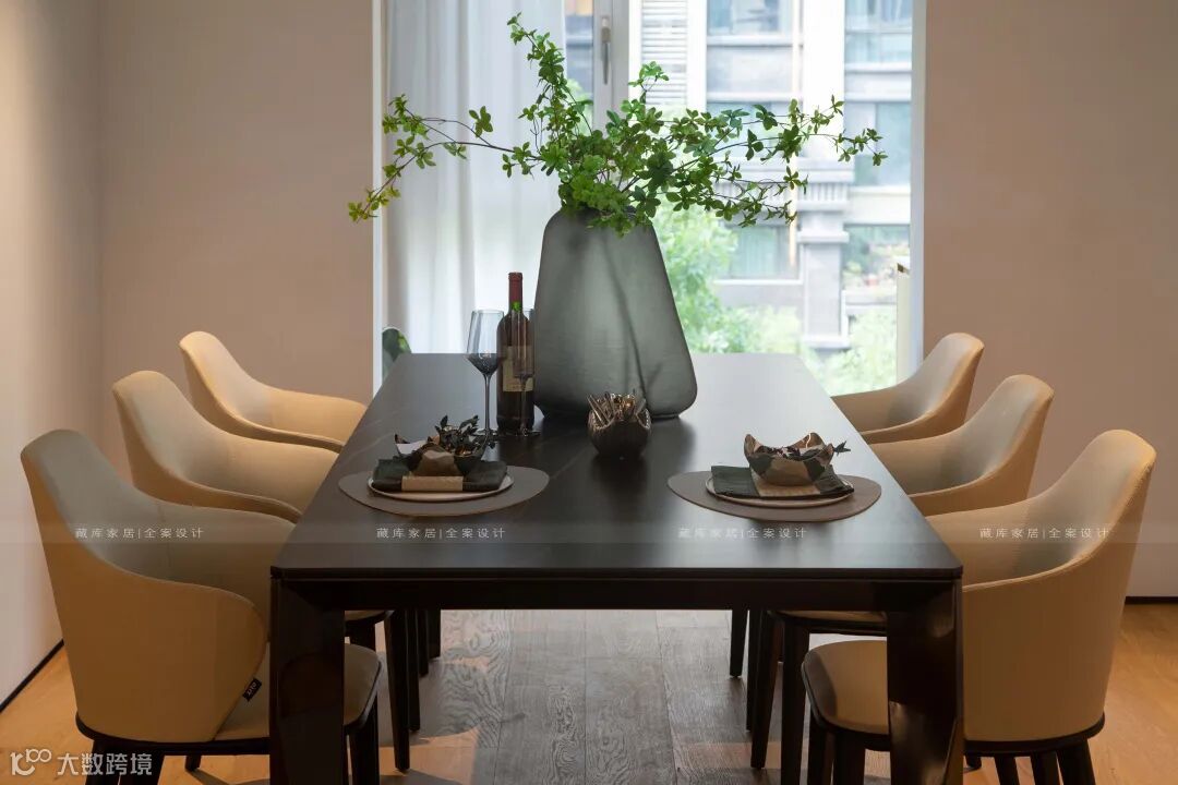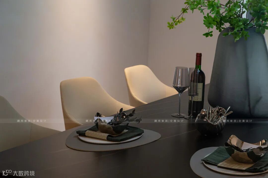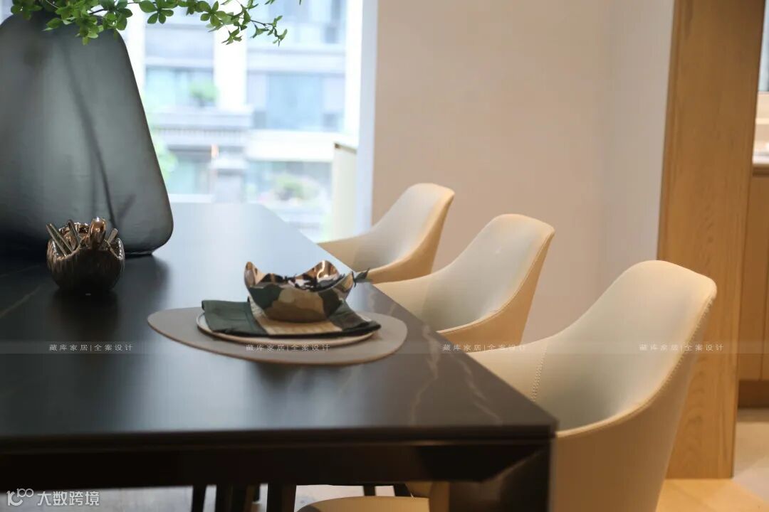 美食是一种生活方式,传达出主人的生活态度和对美食器物的诉求。硬朗的皮质餐椅,与客厅艺术氛围相得益彰,高级轻奢中更透出一股家人共进餐的温馨。