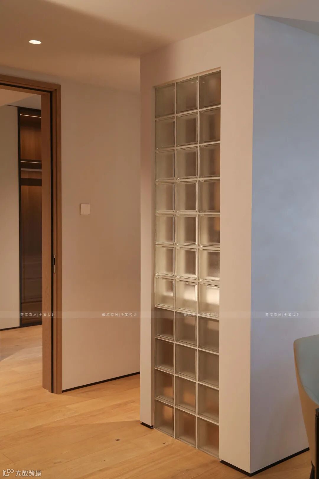 为了创造迎宾之感,设计师以一幅具有现代艺术挂画,白墙LED圆形投光灯,展开客厅公域的白净。