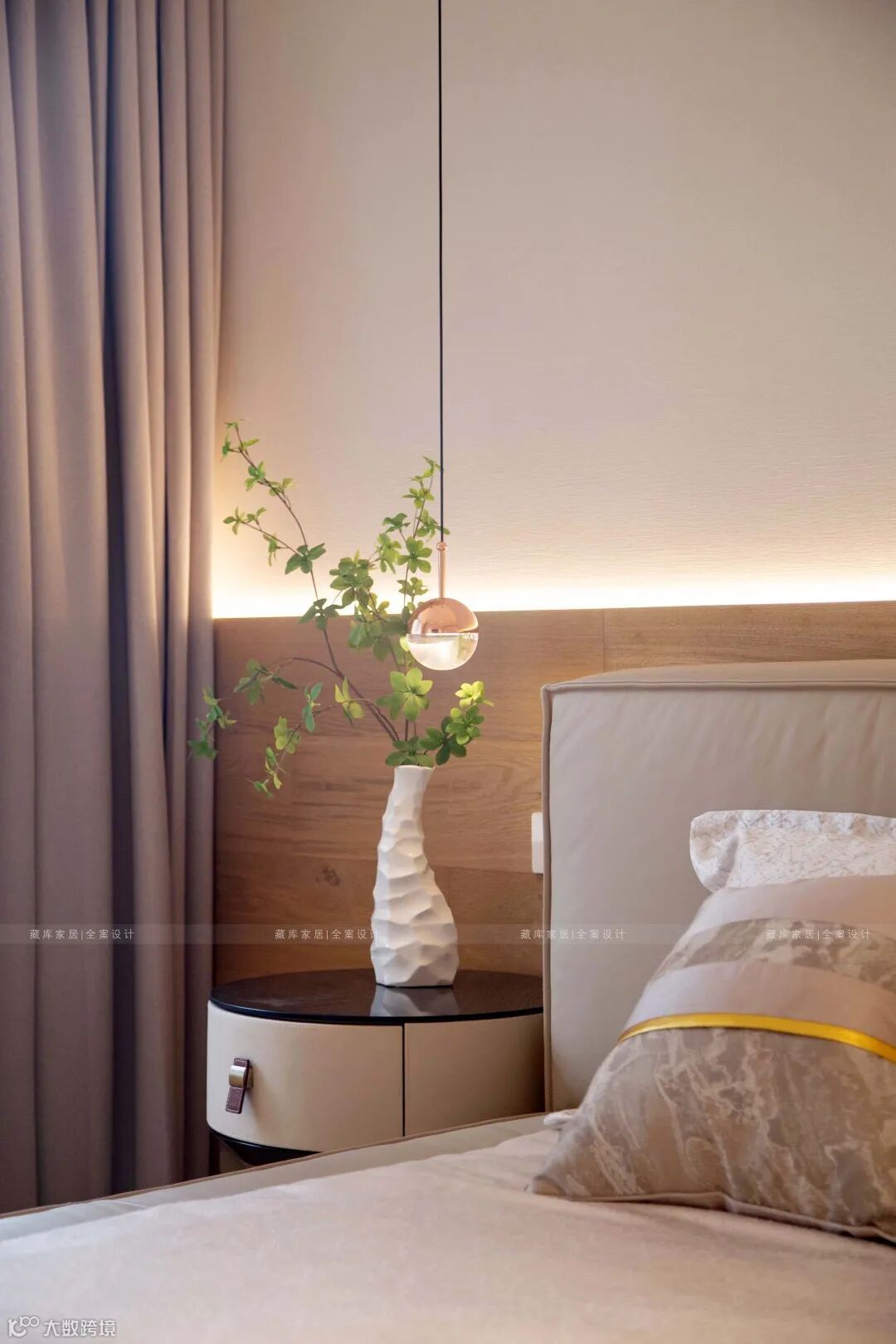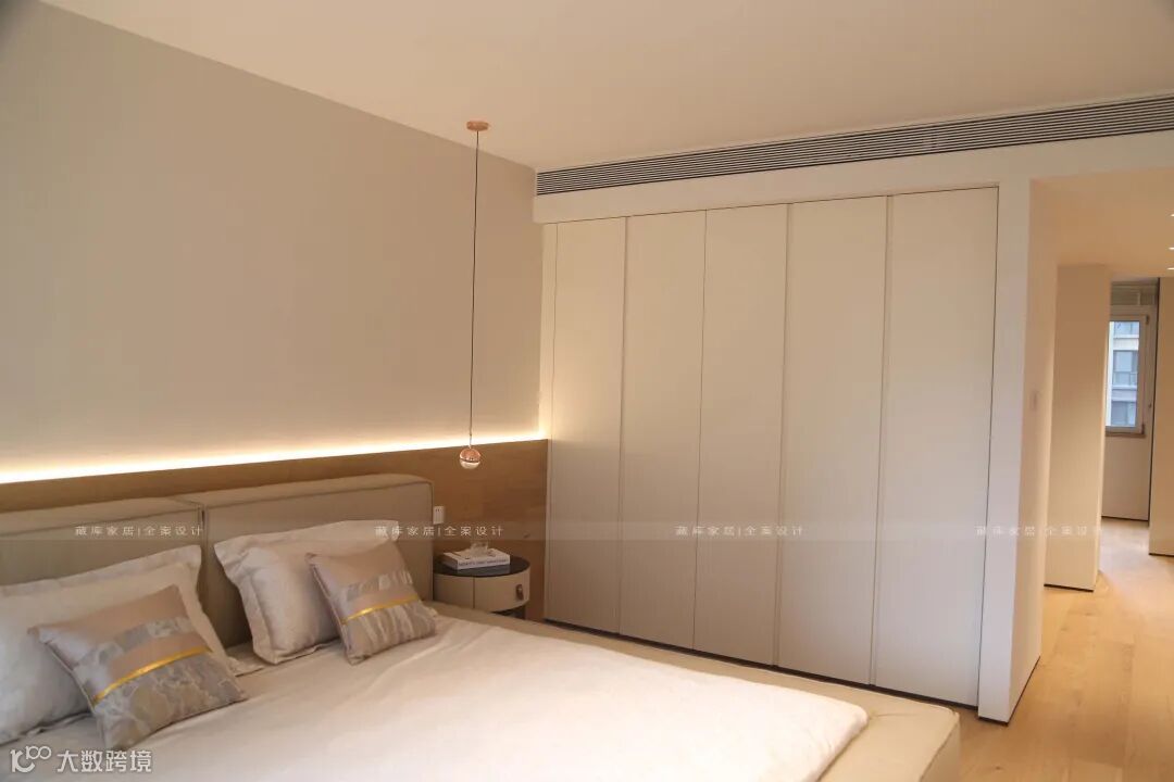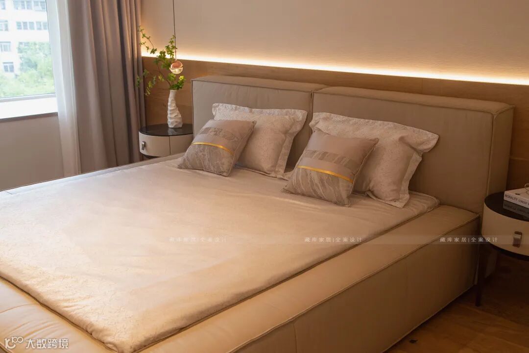 主卧室床具更显极简舒适感,对此藏库全案设计的搭配师综合了屋主的日常习惯,喜好行为,规划出最适合他们的静谧之处。