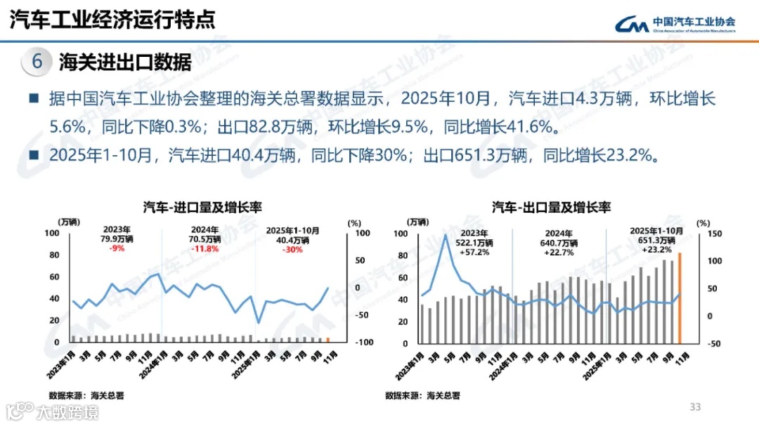 汽车产销延续良好表现。企业抢抓政策窗口期,生产供给依然保持较快节奏,在高基数基础上,产销环比、同比均实现增长。其中,乘用车市场运行平稳,商用车市场持续向好,新能源汽车表现强劲,汽车出口较快增长