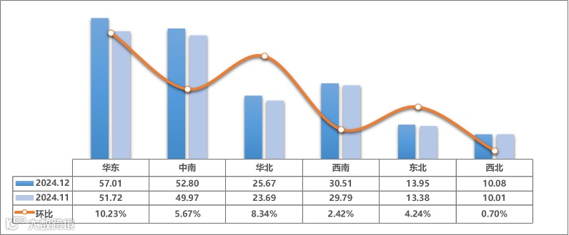 2024年12月,全国二手车市场延续了稳步增长的良好态势,各区域交易量均有所攀升。其中,华北和华东地区继续保持强劲的增长势头,交易量显著提升,成为引领市场增长的主要动力。而其他区域也保持了稳定的增长步伐。
