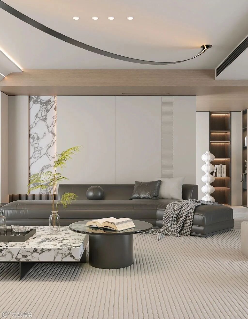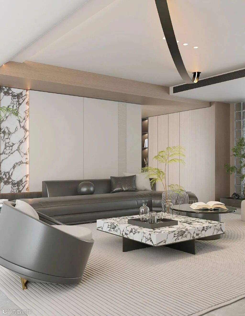 意式轻奢风格的视觉特征是通透、精致、简约。没有过于浓郁和夸张的色彩,应用大块简单色彩,带动低调而内敛的空间氛围。