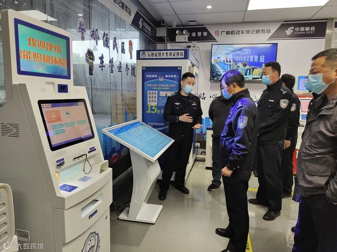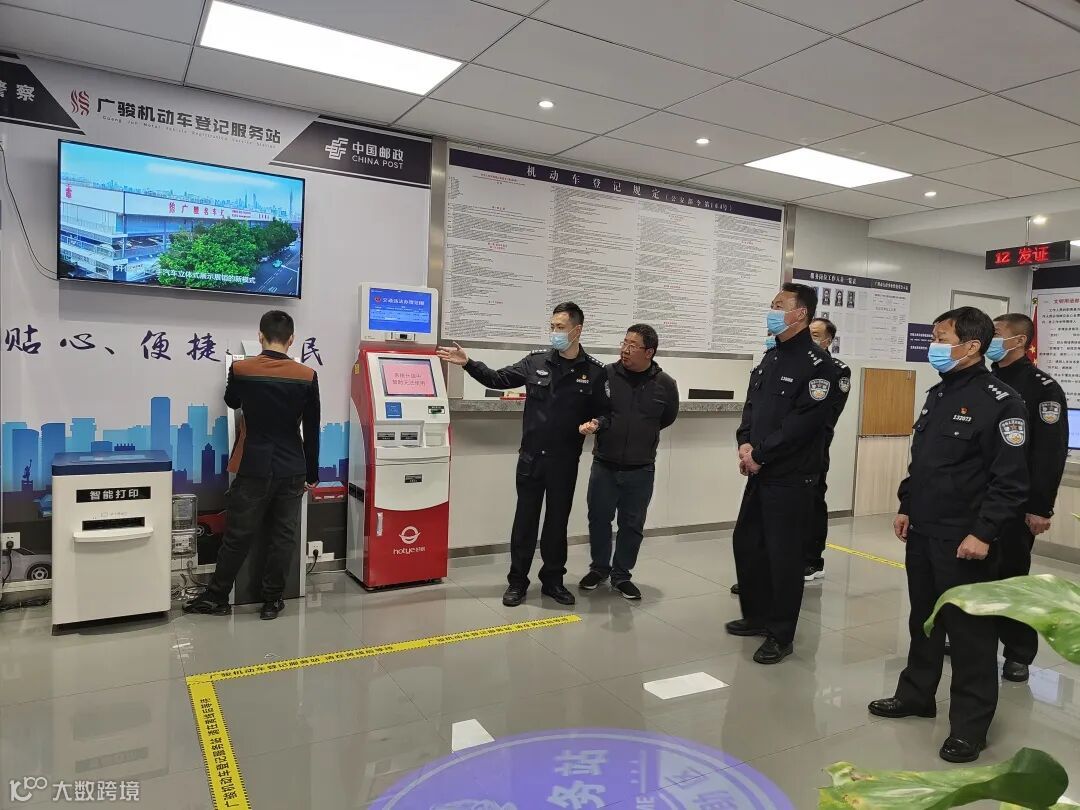 考察团一行先后实地参观了广骏机动车登记服务站业务大厅、业务办理区、信息展示区、机动车查验区和自助业务区等区域,并深入了解了服务站工作人员配置情况,二手车交易发票开具、车辆查验流程以及办理一宗业务的时间。