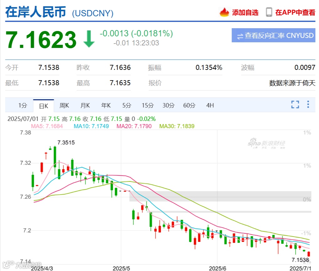 今年上半年,人民币对美元即期汇率的最低点出现在4月9日,盘中一度跌至7.3506,最高点出现在6月26日,盘中最高升至 7.1565,上半年人民币对美元即期汇率的波幅达到2.6%。
