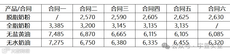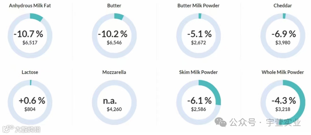 脱脂乳粉价格下跌6.1%,均价2,586美元/公吨;全脂乳粉价格下跌4.3%,均价3,218美元/公吨;黄油价格下跌10.2%,均价6,546美元/公吨;无水奶油下跌10.7%,均价6,517美元/公吨,具体拍卖结果如下: