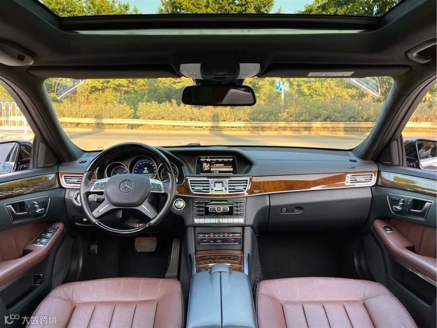 内部方面,这款E级主要以棕色色调为主,大面积的木纹装饰条镶嵌在了中控台、储物格、门板等位置,看起来非常整洁。另外,还配备了四辐式多功能方向盘,质感很软,手感握起来非常贴合。