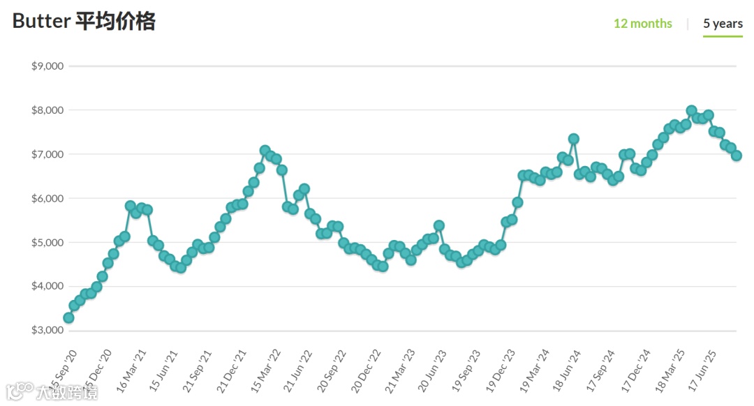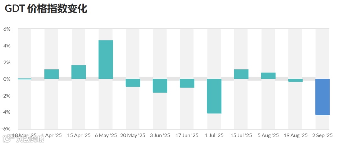 2025年9月2日GDT第387次拍卖,环比上期,各品种投放量均有不同幅度增加,其中脱脂乳粉增量21%。同比去年同期,全脂乳粉投放量持平,脱脂乳粉增量3%,无水奶油增量9%,黄油增量12%。具体如下:
