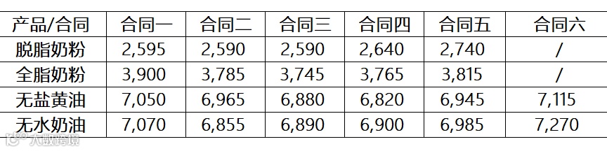 脱脂乳粉价格下跌5.8%,均价2,620美元/公吨;全脂乳粉价格下跌5.3%,均价3,809美元/公吨;黄油价格下跌2.5%,均价6,969美元/公吨;无水奶油下跌2.6%,均价6,917美元/公吨。具体拍卖结果如下: