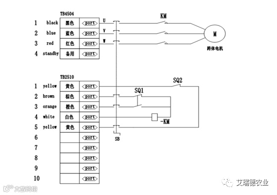 指针机由最后一跨行走,带动倒数第二跨的导向杆,使倒数第二跨和倒数第一跨之间有个角度,位于倒数第二跨上面的中间塔盒,通过导向装置触碰塔盒内部的行程开关SQ1,SQ1通过控制接触器KM来控制驱动电机行走,这样以此类推,直到跨体之间保持一条直线,微动开关断开,跨体停止行走,设备的行走方向如图取决于电控柜输出的橙色和棕色线决定。此外当设备出现故障时,跨体间夹角过大,便会触碰到安全微动开关SQ2,使安全回路断开,设备停机保护。