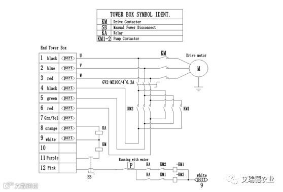 当喷灌机安装尾枪时,通常会安装增压泵进行增压,由于喷灌机跨体电源线只有3根线,增压泵需要和跨体电机共用此电源,但喷灌机需要正反转运行切换的时候,改电源相序会进行调整,如果增压泵电机不进行相应的相序调整势必造成增压泵反转,水压不足,且长时间运行造成增压泵故障。因此在有增压泵的情况下,我们将末端塔盒替换为增压泵塔盒,增压泵塔盒具有调整相序,根据水压自动开闭功能。