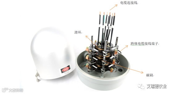 指针式喷灌机中心点是固定不动的,跨体围绕中心点转圈,如果没有集电环,跨体电缆势必会出现缠绕,最终导致设备无法运行。集电环其实就是固定滑环,外层是碳刷,中心轴安装在喷灌机中心点上方,设备运行时,中心滑环和中心点不动,外层碳刷围绕滑环运动。电缆通过中心孔接线到滑环线上,跨体线缆连接碳刷端子,这样滑环就可以不断的给设备供电了。