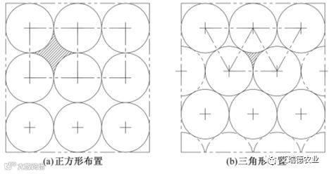 在正方形地块上分别采用正方形和三角形两种机组布置方式。从阴影部分面积可以看出,三角形布置方式漏灌面积比正方形布置方式要小。三角形布置的土地利用率可达90%,相对于正方形布置提高了12%。