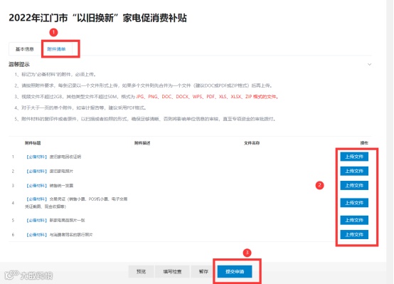 (3)依据事项要求,清晰上传新购家电及报废旧家电的6份附件材料,确认无误后点击【提交申请】。