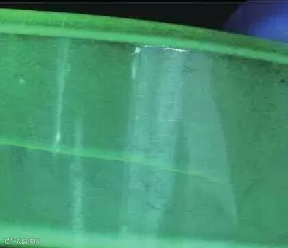 宜采用荧光磁粉探伤来提高灵敏度和可靠性。淬火缺陷磁痕一般呈斜线形、圆弧形、树枝状或网状,起始部位较宽,随延伸方向逐渐变细。