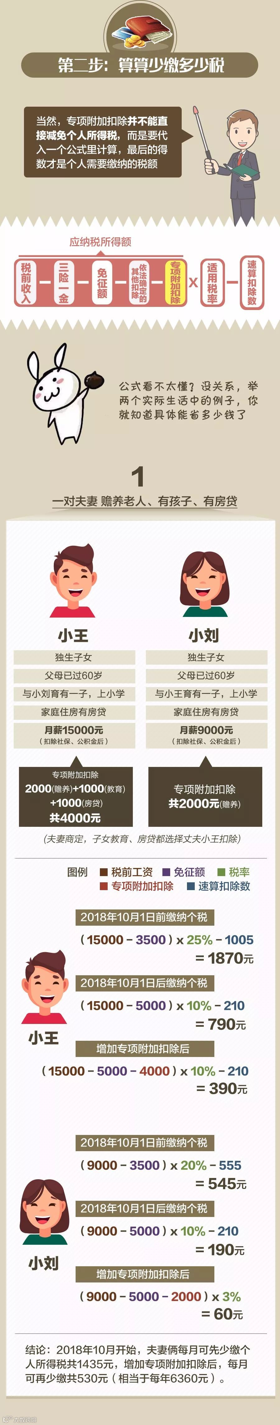 《暂行办法》明确了个人所得税法规定的子女教育、继续教育等6项专项附加扣除的具体实施办法。享受这些专项附加扣除,需要哪些条件?通过这些扣除项目,纳税人可以少缴多少个税?跟随下面这张图,一起来算算。