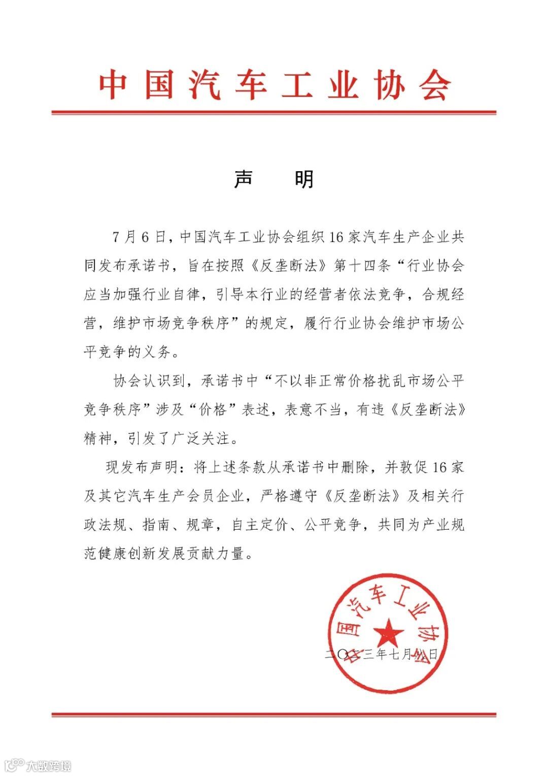 7月8日,中国汽车工业协会发布声明。声明称,关于16家汽车生产企业签署的《汽车行业维护公平市场秩序承诺书》中,“不以非正常价格扰乱市场公平竞争秩序”涉及“价格”表述,表意不当,有违《反垄断法》精神,现将上述条款从承诺书中删除,并敦促16家及其它汽车生产会员企业,严格遵守《反垄断法》及相关行政法规、指南、规章,自主定价、公平竞争,共同为产业规范健康创新发展贡献力量。