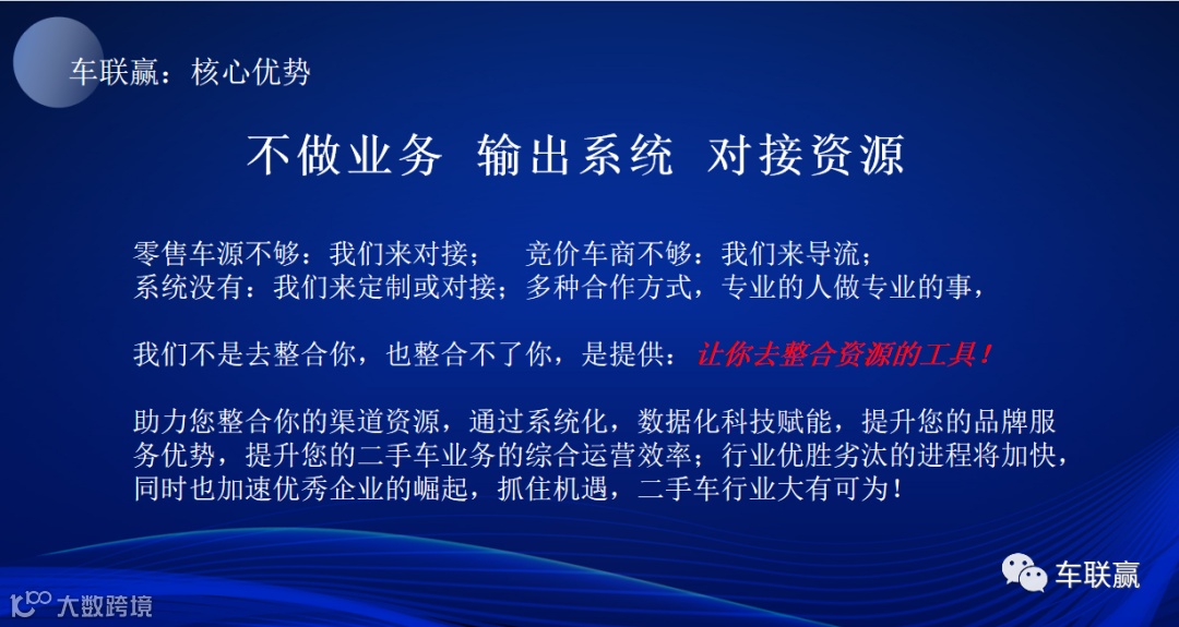 您的业务您做主,旨在通过我们自身技术优势,及行业经验,助力您整合您的渠道资源,通过系统化,数字化的科技赋能,提升您的品牌影响力,提升您的二手车业务综合运营效率;