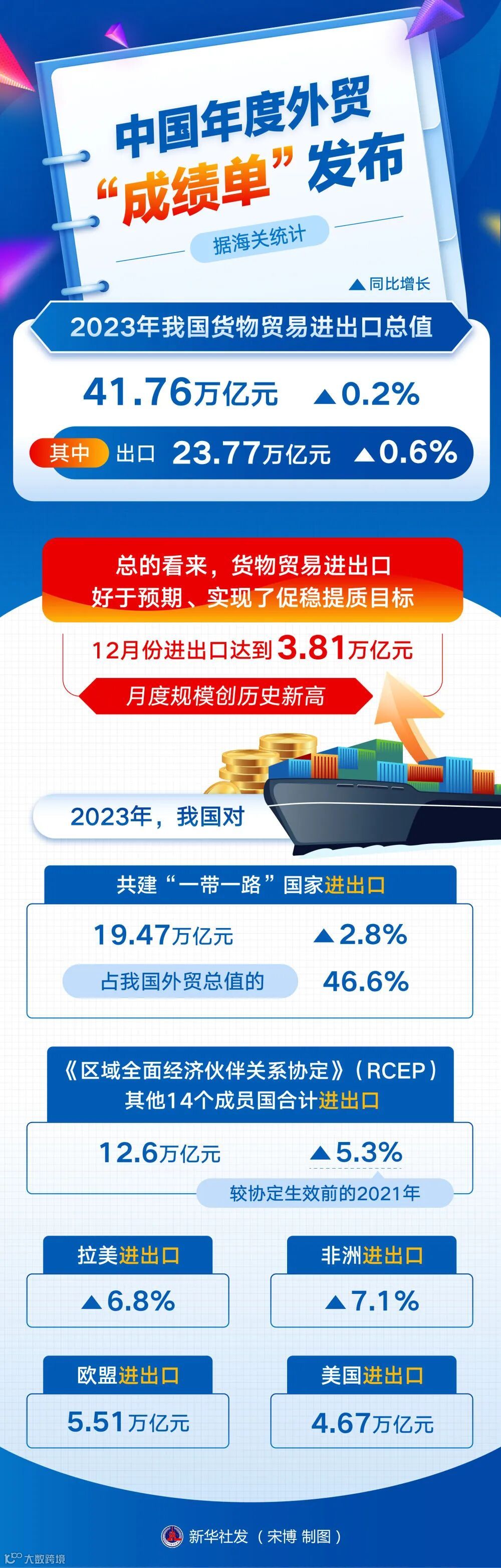 “新三样”产品出口首次突破万亿元大关;有进出口实绩的外贸主体首次突破60万家,创历史新高;跨境电商进出口2.38万亿元;贸易伙伴多元共进,“一带一路”占比提升……这些新鲜出炉的数据充分展现着中国经济发展的强韧性,凝聚着中国外贸人勇拓海外市场的强实力,更蕴含着中国外贸继续向好发展的信心和底气。