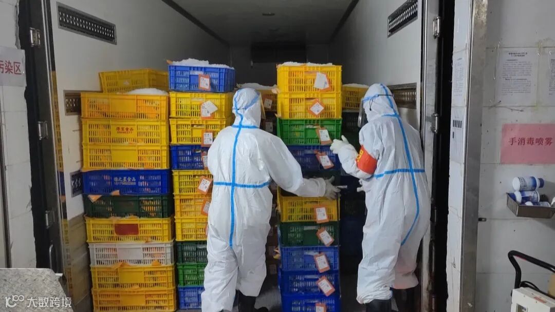 在得宝食品有限公司,货车抵达装卸点后,工作人员立即对车厢和周转筐进行全面消毒。司机全程佩戴口罩、不得下车、不得开车门开窗,与外界全程无接触。货物由专人搬运到车上。为了确保安全、稳定供应,企业把装货时间调到深夜,并对加工生产各环节实施全闭环管理。