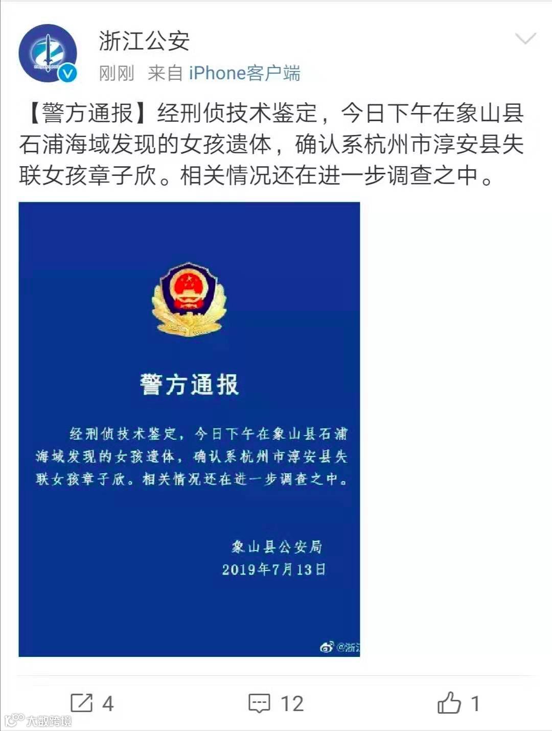 13日下午,官方发布通报:7月13日中午12时30分许,在象山石浦海域海面上发现一具遗体,衣着、体貌特征疑似失联女童,将通过相关手段进一步确认身份。