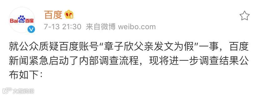 当晚21:30,官方账号@百度 再次回应“章子欣父亲发文为假”一事。