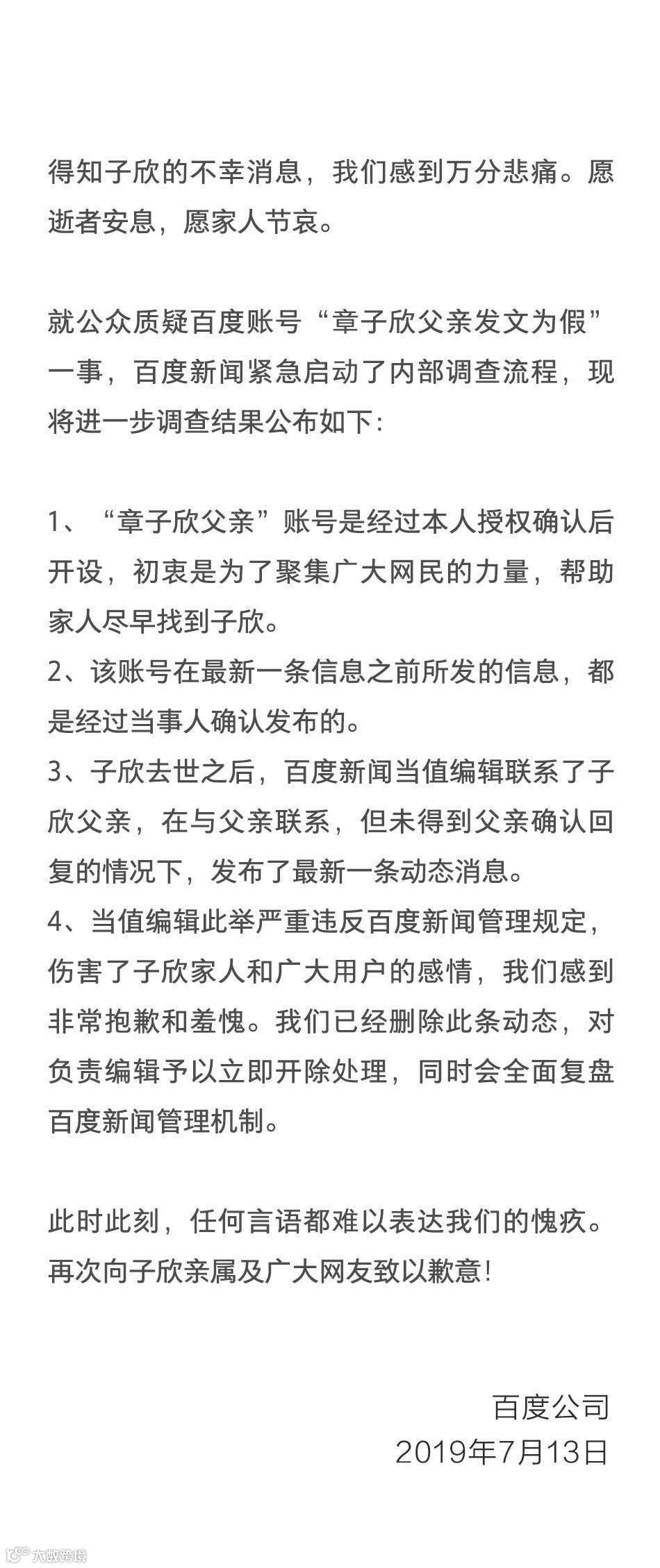 7月13日18:57,@百度新闻 对媒体质疑“章子欣父亲”百度账号为假一事做出回应,称经过章子欣父亲授权确认,该百度账号正式开通运营。“故,媒体所质疑的‘章子欣父亲’账号为假一事,并不属实。”
